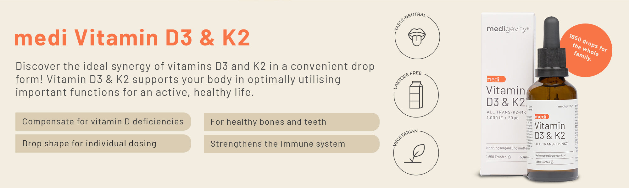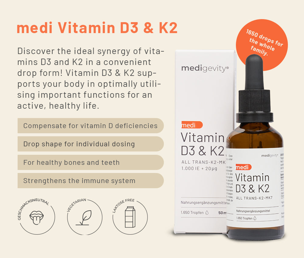 • Bones & immune system – with vitamin D3 + K2 , which together ensure strong bones and a stable immune system.