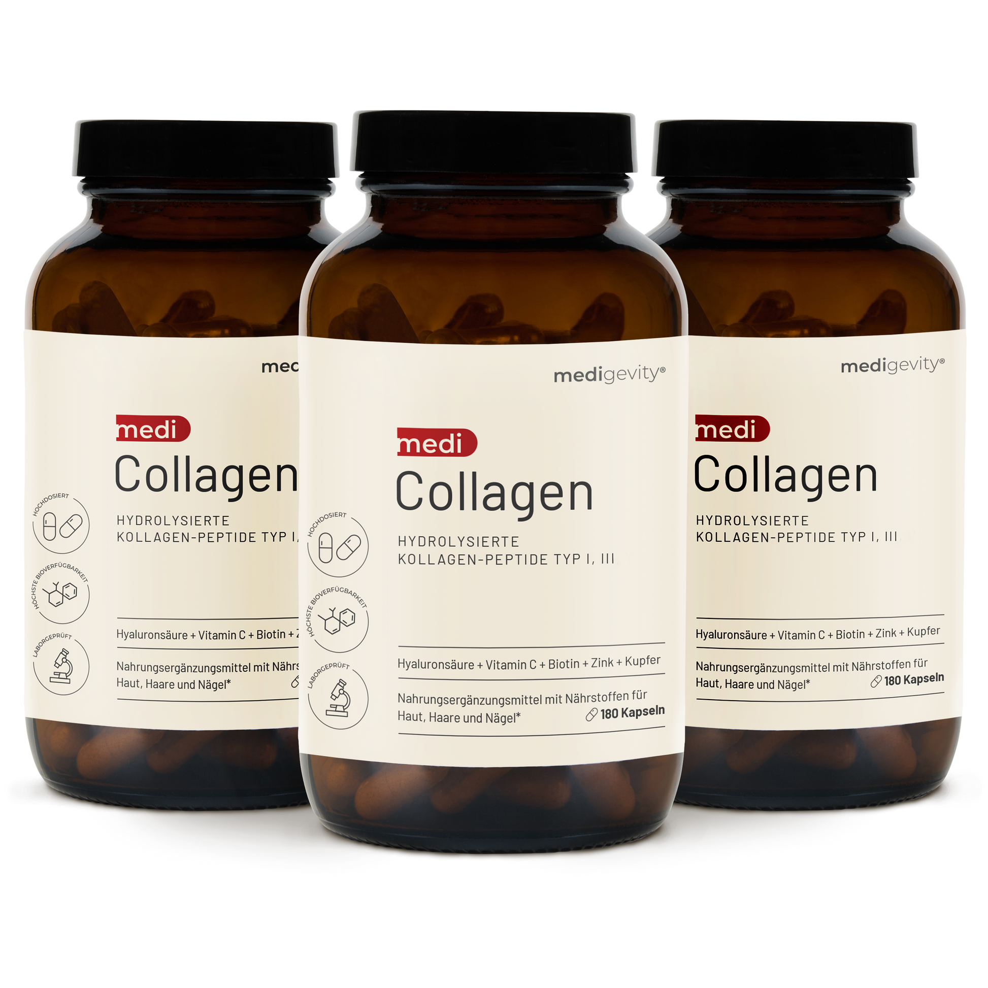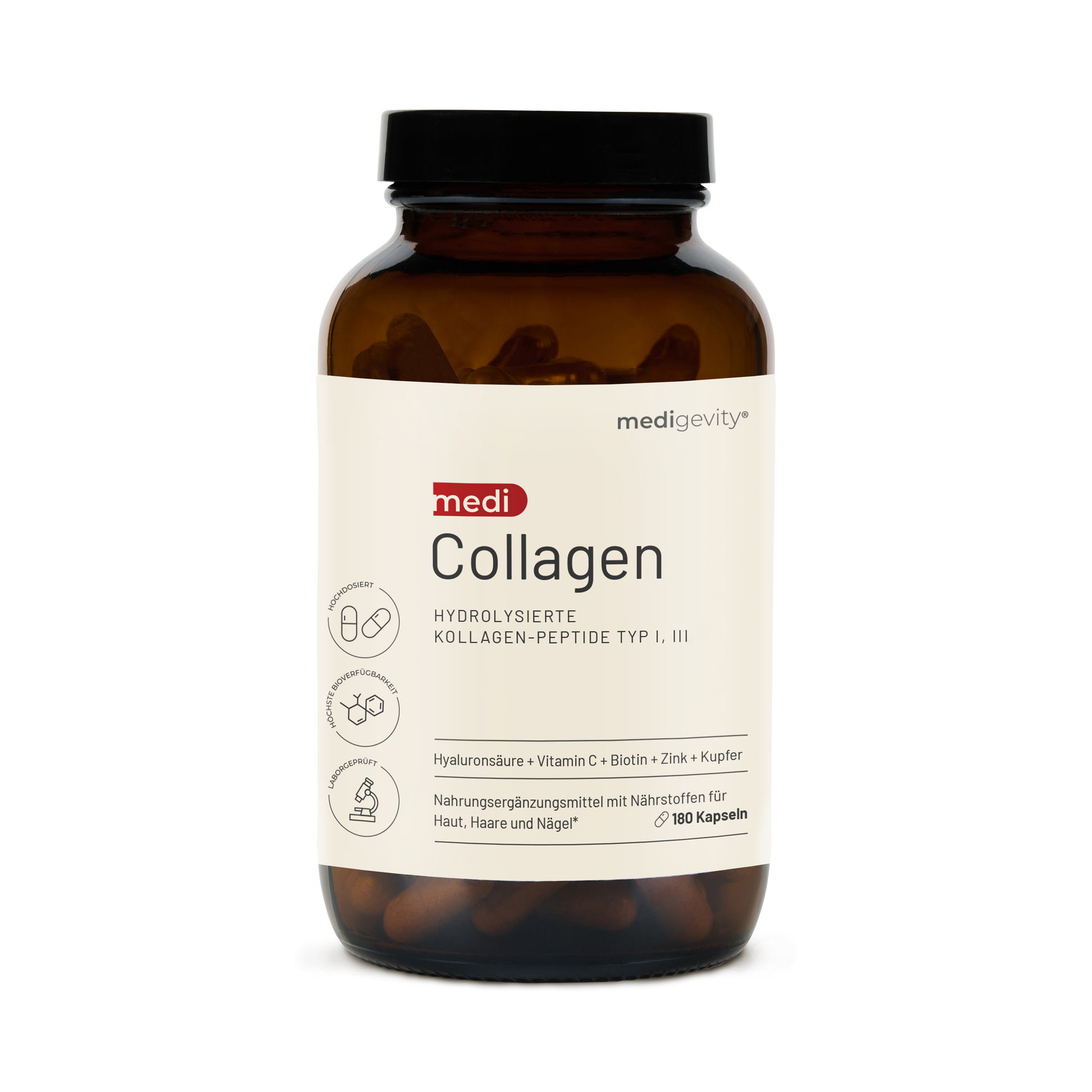 mediCollagen Kollagen Kapseln enthält eine einzigartige Rezeptur, die von der Anti-Aging Expertin Dr. Katharina Brüggemann und ihrem wissenschaftlichen Team entwickelt wurde, um das Wachstum von Haut, Haaren und Nägeln zu fördern und gleichzeitig Ihre Gesundheit von innen heraus zu unterstützen.